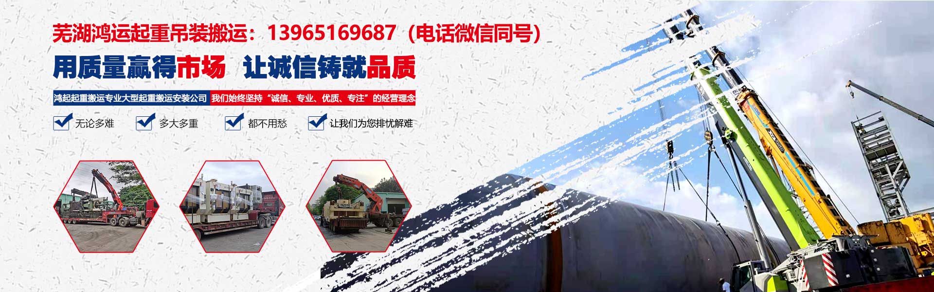 湖市鴻運(yùn)起重裝卸有限公司從事專(zhuān)業(yè)機(jī)械設(shè)備維修安裝:承接大件起重設(shè)備搬運(yùn)安裝工程。吊裝移位、大型機(jī)床、注塑機(jī)、冷水機(jī)組、發(fā)電機(jī)、醫(yī)療設(shè)備、印刷機(jī)、空調(diào)機(jī)組、鍋爐等安裝調(diào)試。油壓機(jī)、離心機(jī)組。橋梁架設(shè)、機(jī)場(chǎng)、港口、鐵路、機(jī)械設(shè)備搬等。承接市區(qū)及省內(nèi)外大笨重設(shè)備起重、運(yùn)輸就位??照{(diào)機(jī)組,電梯吊裝,物流運(yùn)輸?shù)龋瑥S(chǎng)房、單位、工廠(chǎng)、學(xué)校、工程搬家、保潔。